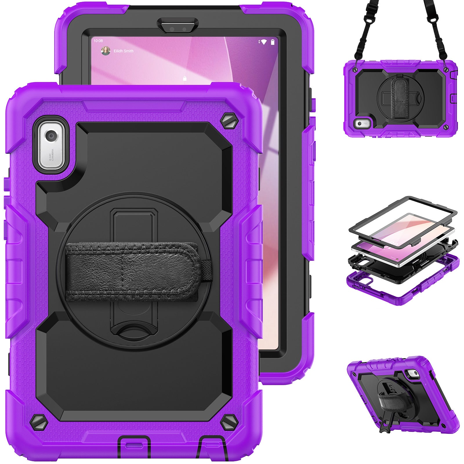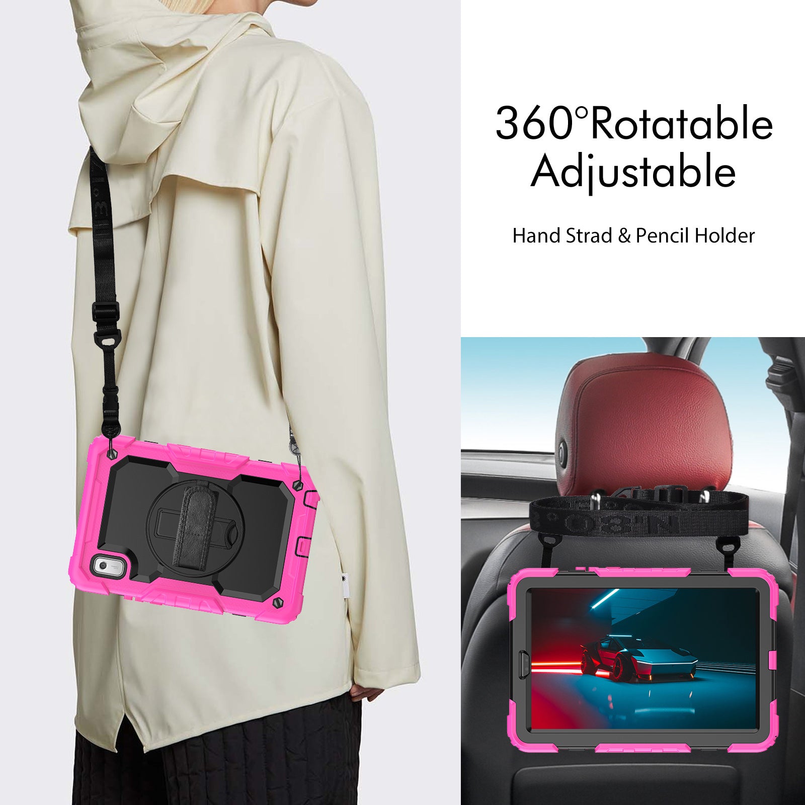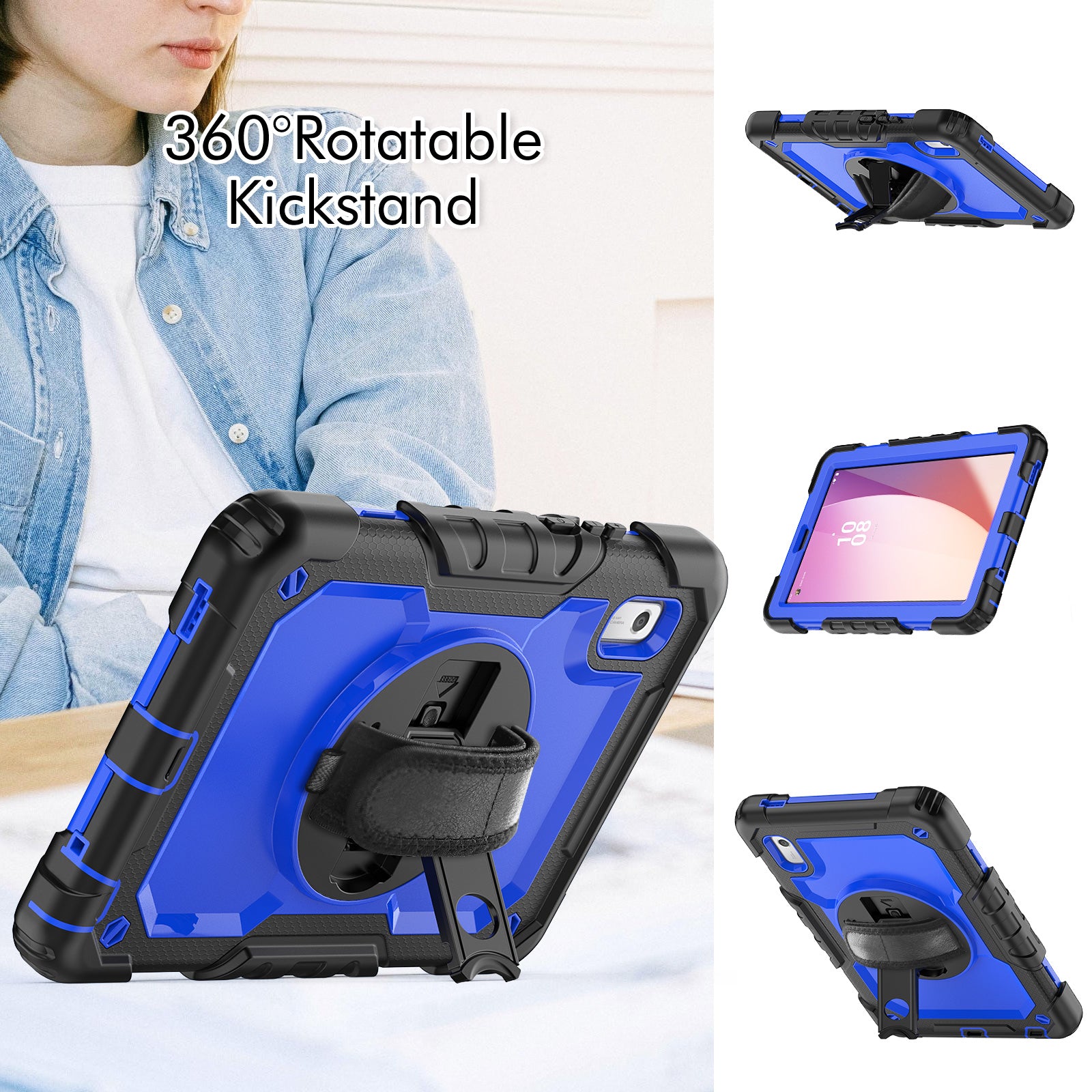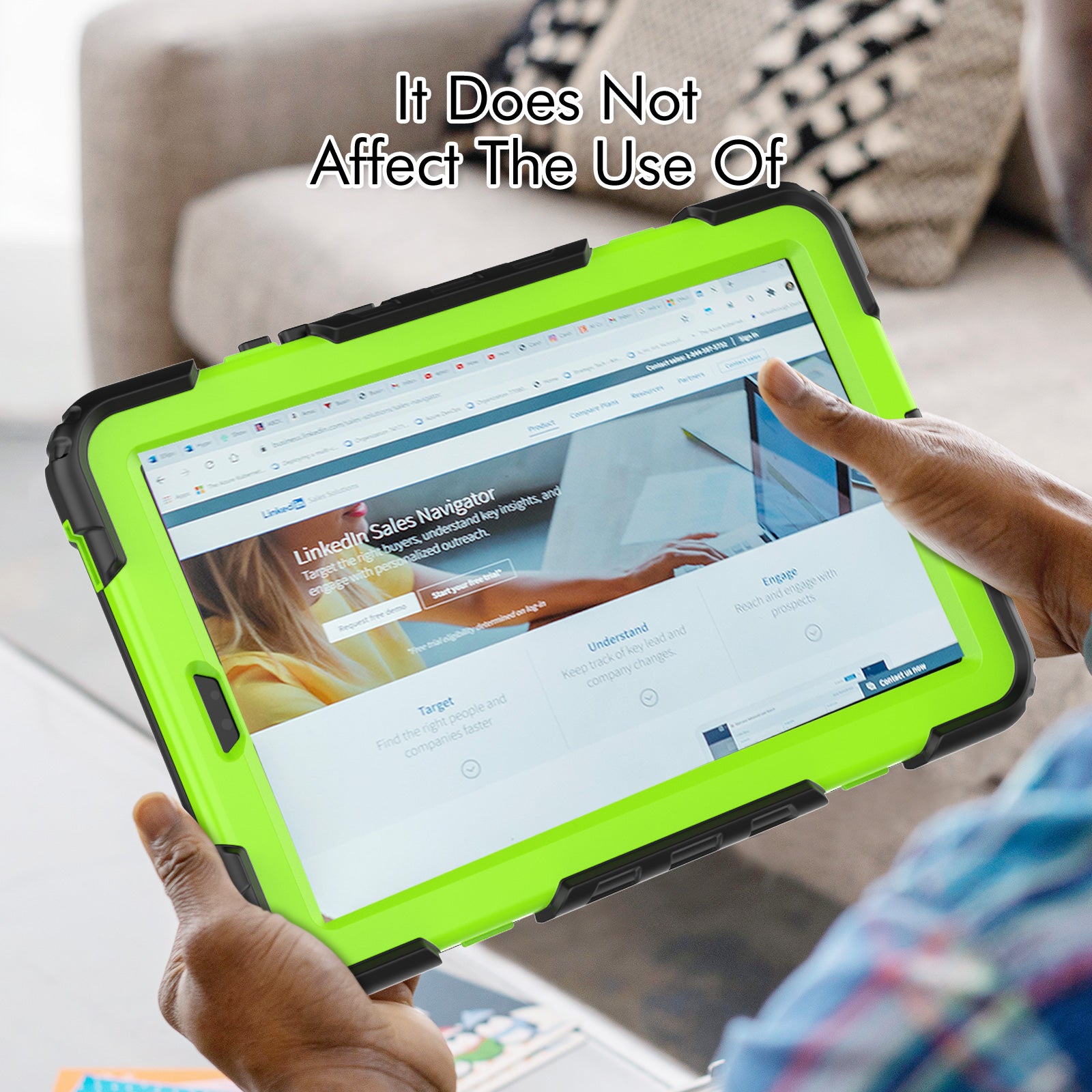 This 3-layers multifunction tablet case is combined with hard PC frame with built-in PET screen protector, hard PC inner layer with built-in kickstand hand strap, and outer silicone layer. Impact-resistant design and shock-absorbing silicone + PC materials fully cover the back and edges, protecting against accidental drops and falls.. The rotary kickstand can free your hands when you're reading, watching, and surfing the internet in your free time. The portable hand grip kickstand is designed for easy carrying.