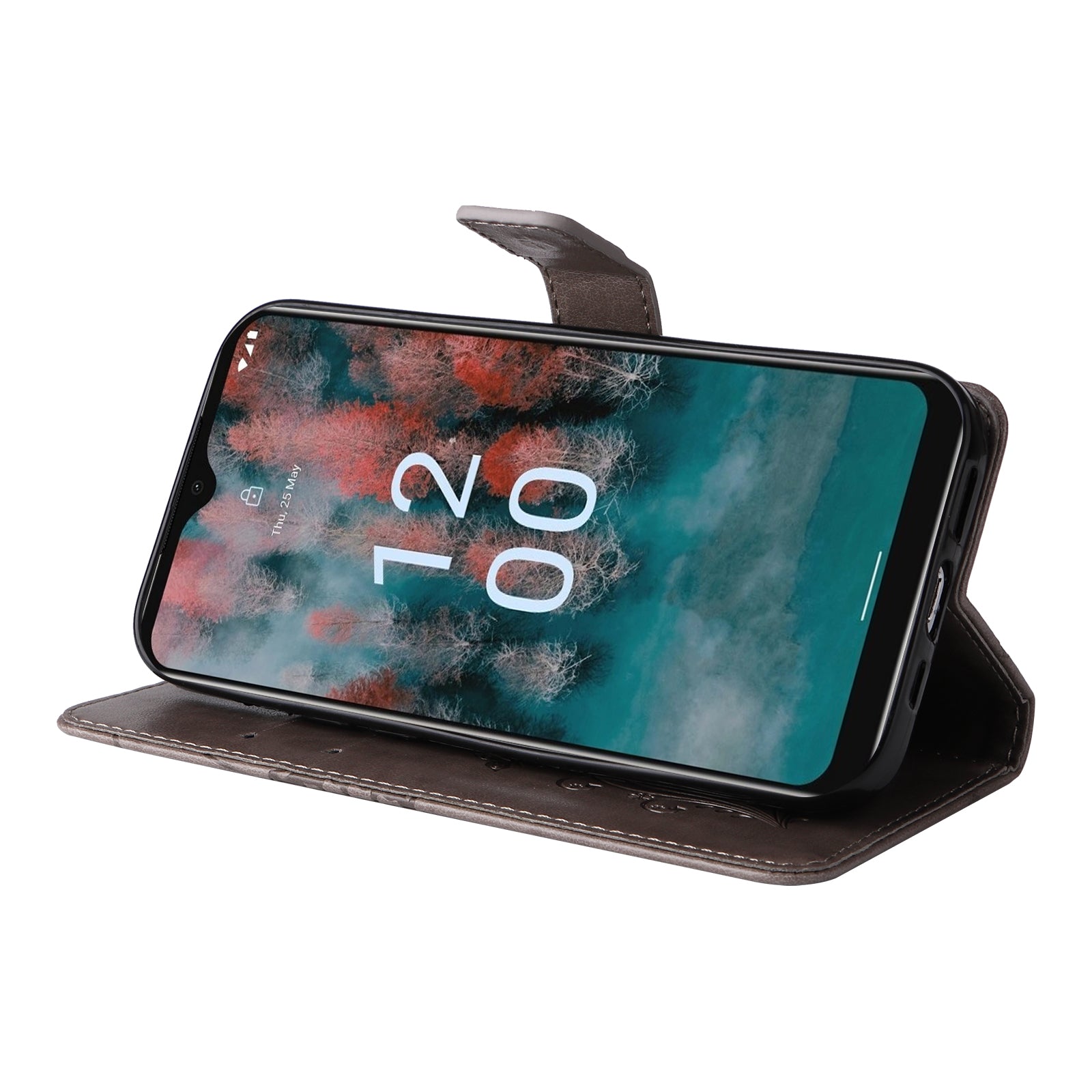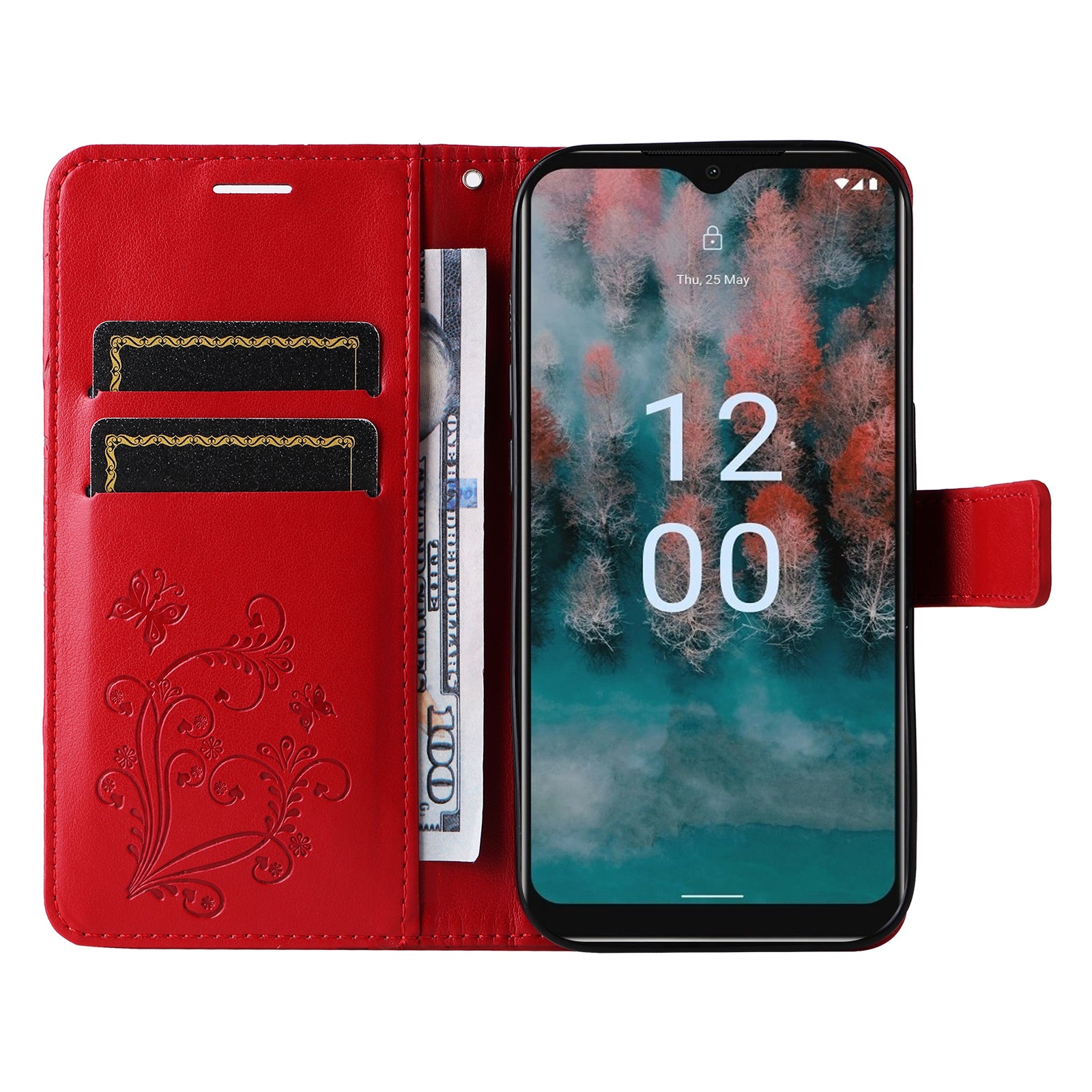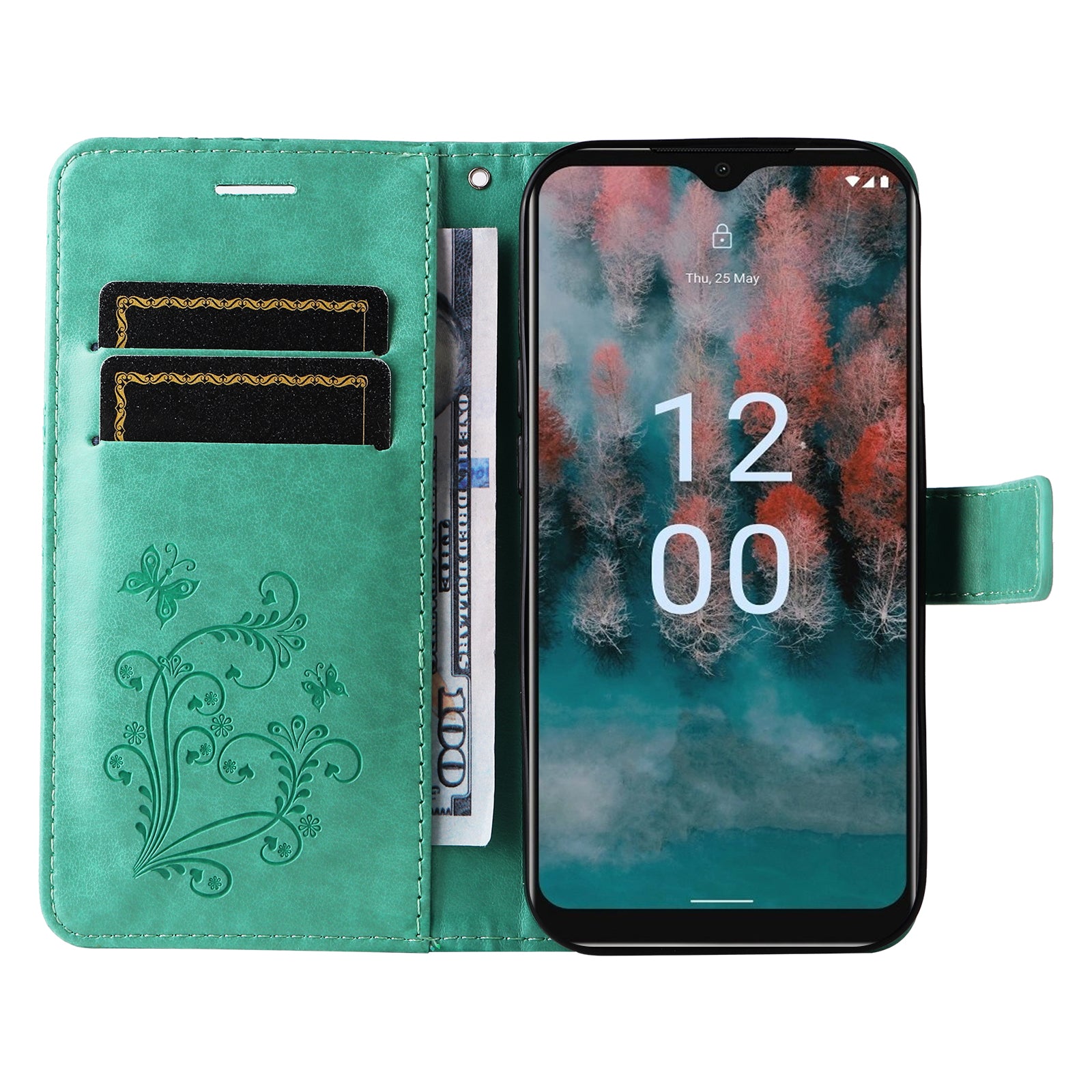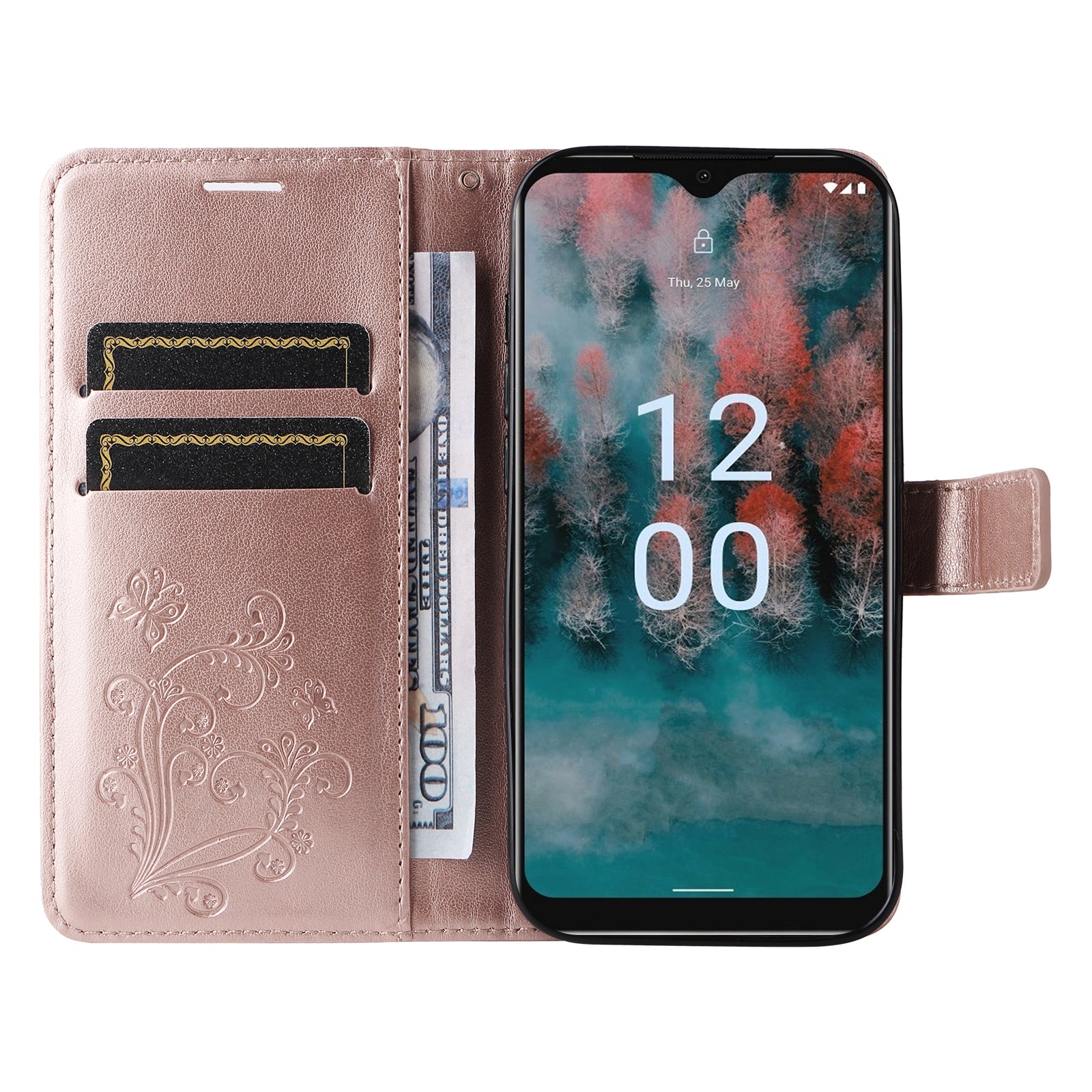 KT Imprinting Flower Series-2 Leather Phone Case for Nokia C12 4G / C12 Plus / C12 Pro , Stand Wallet Butterfly Flower Imprinted Cover