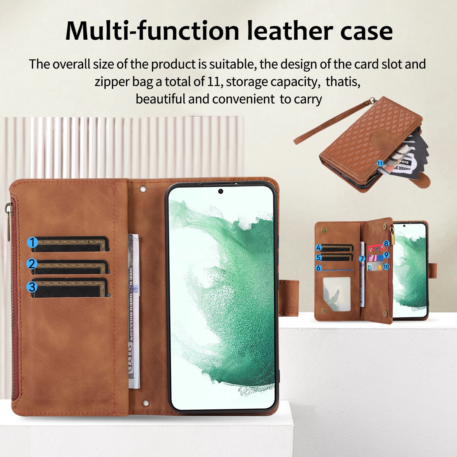 - Designed with 9 card slots + 2 cash bits, easy to store your essential card and cash