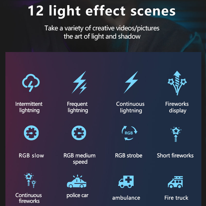 - 12 lighting effect scene modes, the scene modes can be shifted freely, create various atmosphere easily