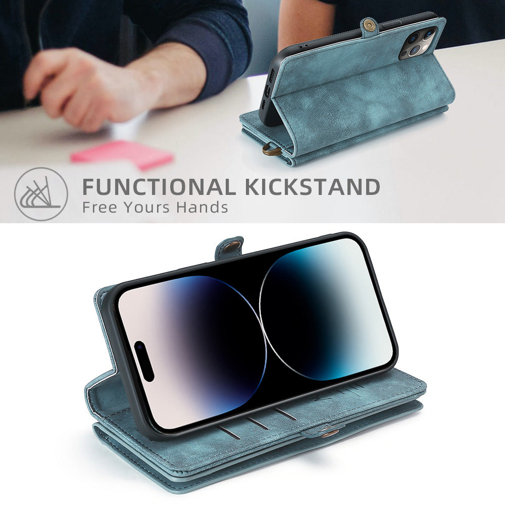 This phone case is made of PU leather and TPU material, which is durable and wear-resistant. The phone case and wallet can be detached for separate use, and they combine by strong magnet.