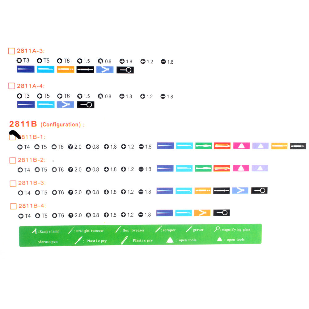 - Sepcifications of the 8 screwdrivers are: 1 x 2.0 slot ,1 x T6 hexalobular socket,1 x T5 hexalobular socket,1 x T4 hexalobular socket,1 x 1.5 pentalobe,1 x 0.8 pentalobe,1 x 2.0 Phillips,1 x 1.5 Phillips