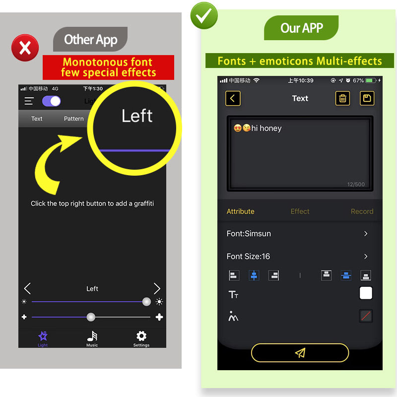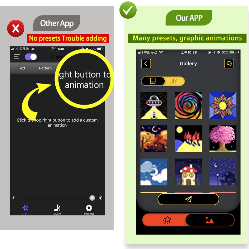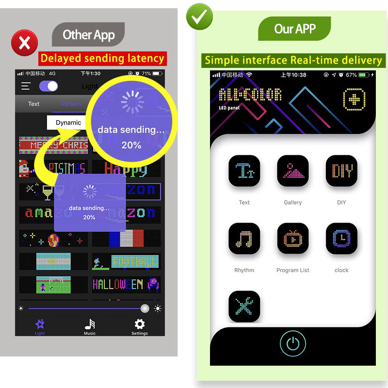 - Built-in Images/Animations: With multiple images and animations, you can freely choose your basic style. You can also via APP editor text, graffiti, and animations, can also adjust the display content colors, brightness, speed and display mode