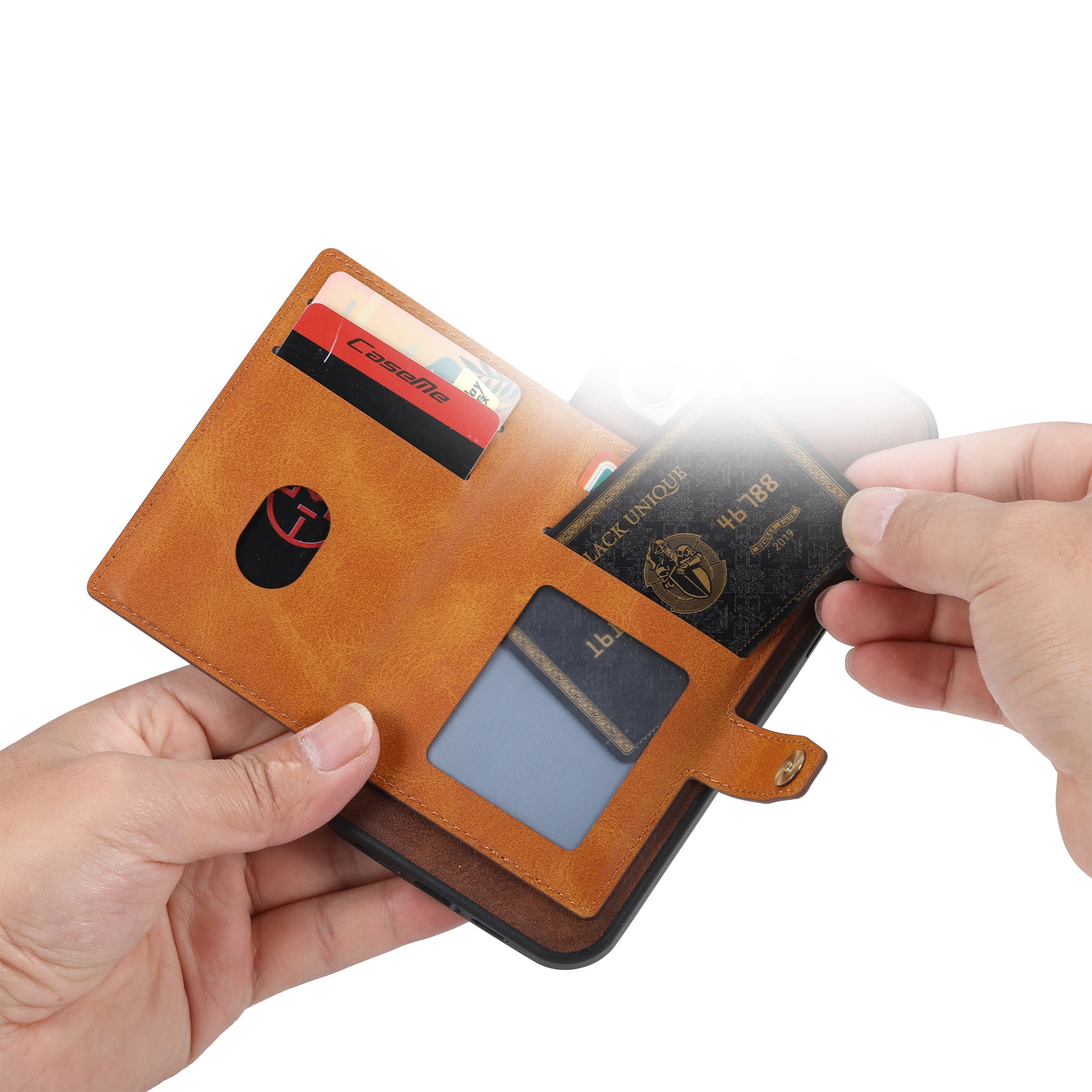 - Built-in ID/credit card slots on the back with metal snap-on closure