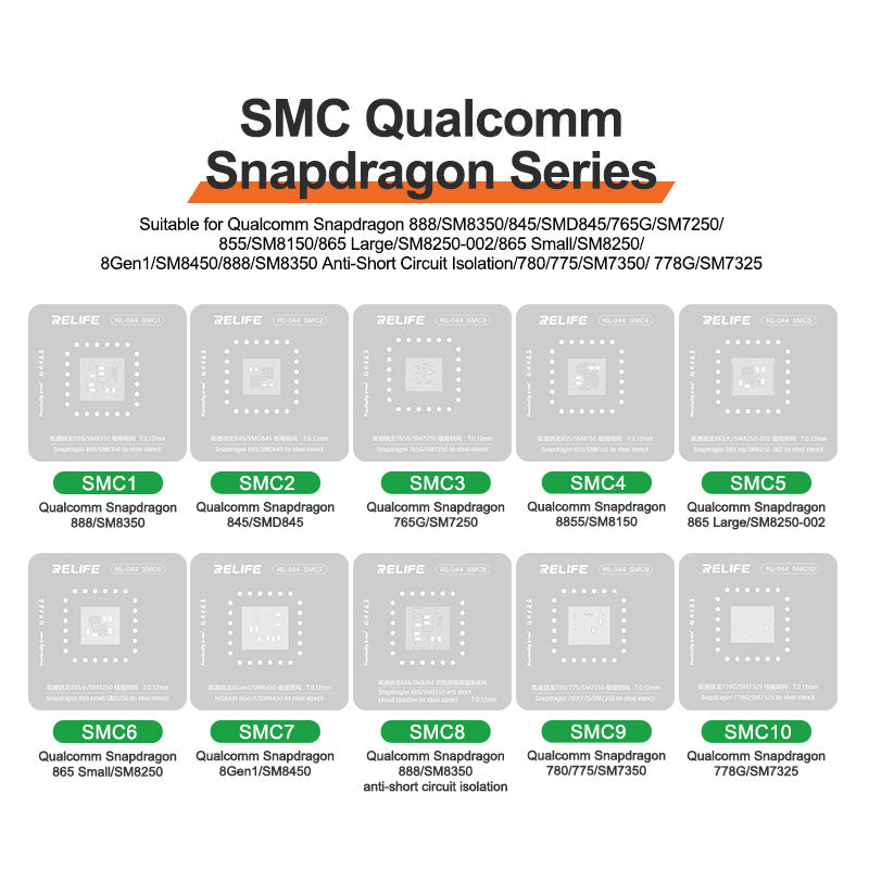 - Suitable for Qualcomm Snapdragon 888/SM8350/845/SMD845/765G/SM7250/855/SM8150/865 Large/SM8250-002/865 Small/SM8250/8Gen1/SM8450/888/SM8350 Anti-Short Circuit Isolation/780/775/SM7350/ 778G/SM7325/Dimensity 810/MT6833V/720/MT6853V/800/MT6873V/900/MT6877V/1000/MT6885Z/9000/MT6983Z/Hisilicon 710 HI6260/810 HI6280/960 HI3660/970 HI367 0/980 HI3680/985/820 HI6290/L/990 HI3690 5G/Kirin 990/4G HI3690/9000 HI36A0/Hisilicon Qualcomm RAM upper layer/Kirin 9000 upper layer/Kirin 970/980/990 upper layer/Snapdragon 865+/870/888 upper layer/BGA 134/153/ 162/178/211/254