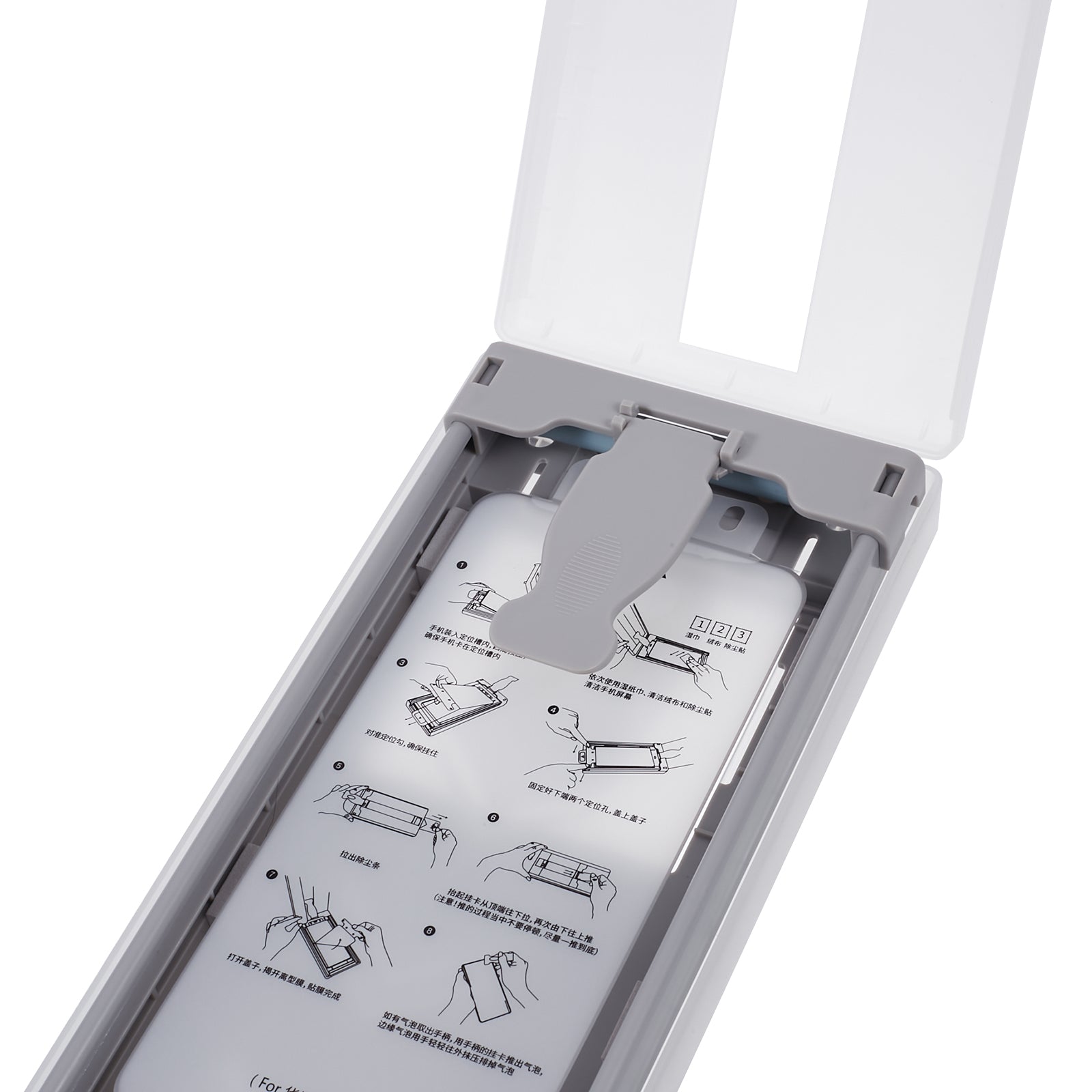 - Open the lid, peel off the back film, and the screen protector is installed