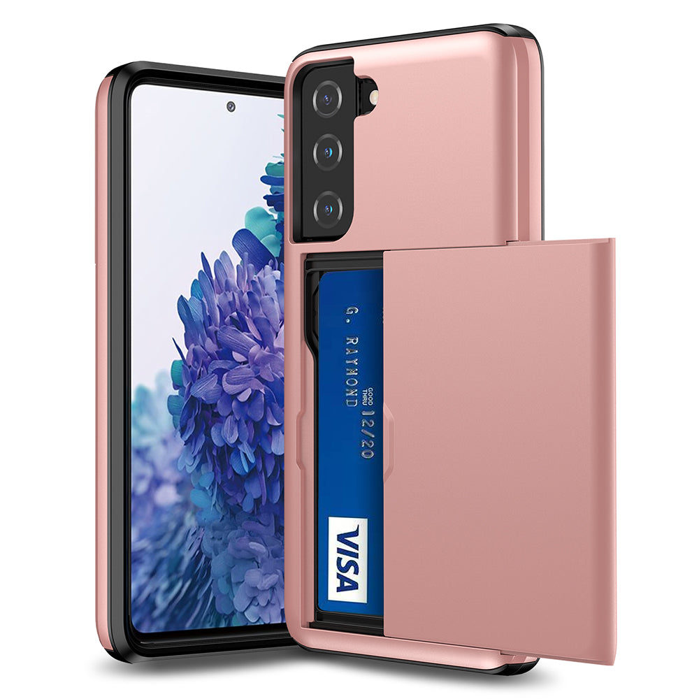Sliding Card Holder Plastic + TPU Hybrid Phone Cover for Samsung Galaxy S21 FE