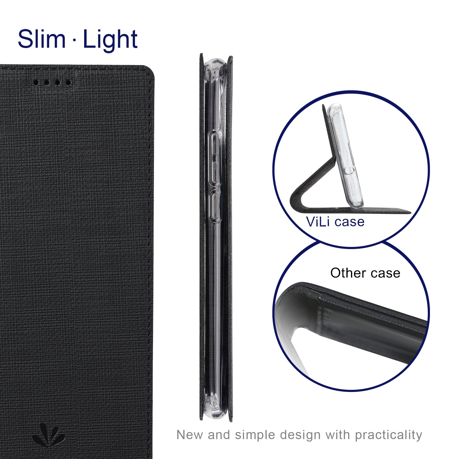 VILI DMX series phone case uses good quality PU leather and TPU materials, with simple cloth texture, protecting your phone in compact style. There is a PET board inside the front cover which adds a stronger protective effect to your phone. The built-in one card slot is designed for storing your important cards. The case can be folded as a supporting stand for easy viewing. It protects your phone from scratches, bumps, dings and other damages in daily use.