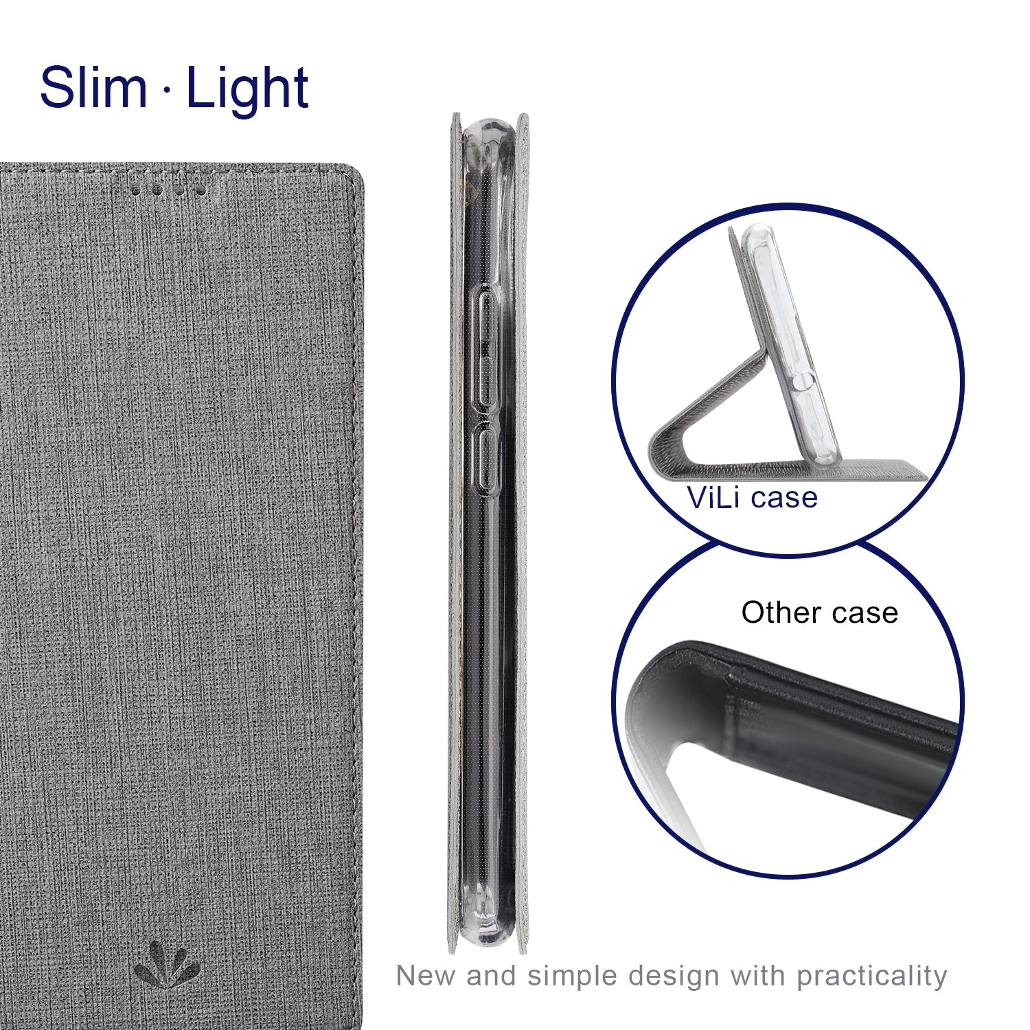 VILI DMX series phone case uses good quality PU leather and TPU materials, with simple cloth texture, protecting your phone in compact style. There is a PET board inside the front cover which adds a stronger protective effect to your phone. The built-in one card slot is designed for storing your important cards. The case can be folded as a supporting stand for easy viewing. It protects your phone from scratches, bumps, dings and other damages in daily use.