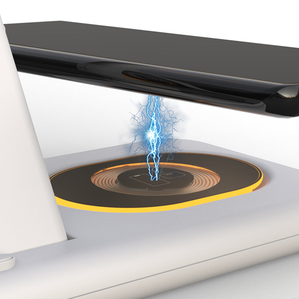 - 6-in-1 design, support phone/earphone/watch wireless charging at the same time, with USB port to charge phone, also has night light and phone holder function